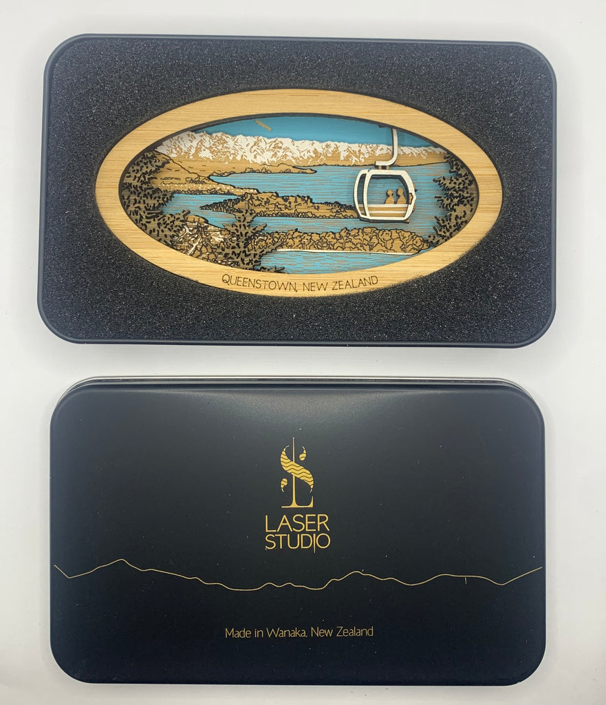 Our Queenstown Mini-Scenic features the Gondola and pine trees in the foreground with Queenstown township, lake and The Remarkables backdrop.