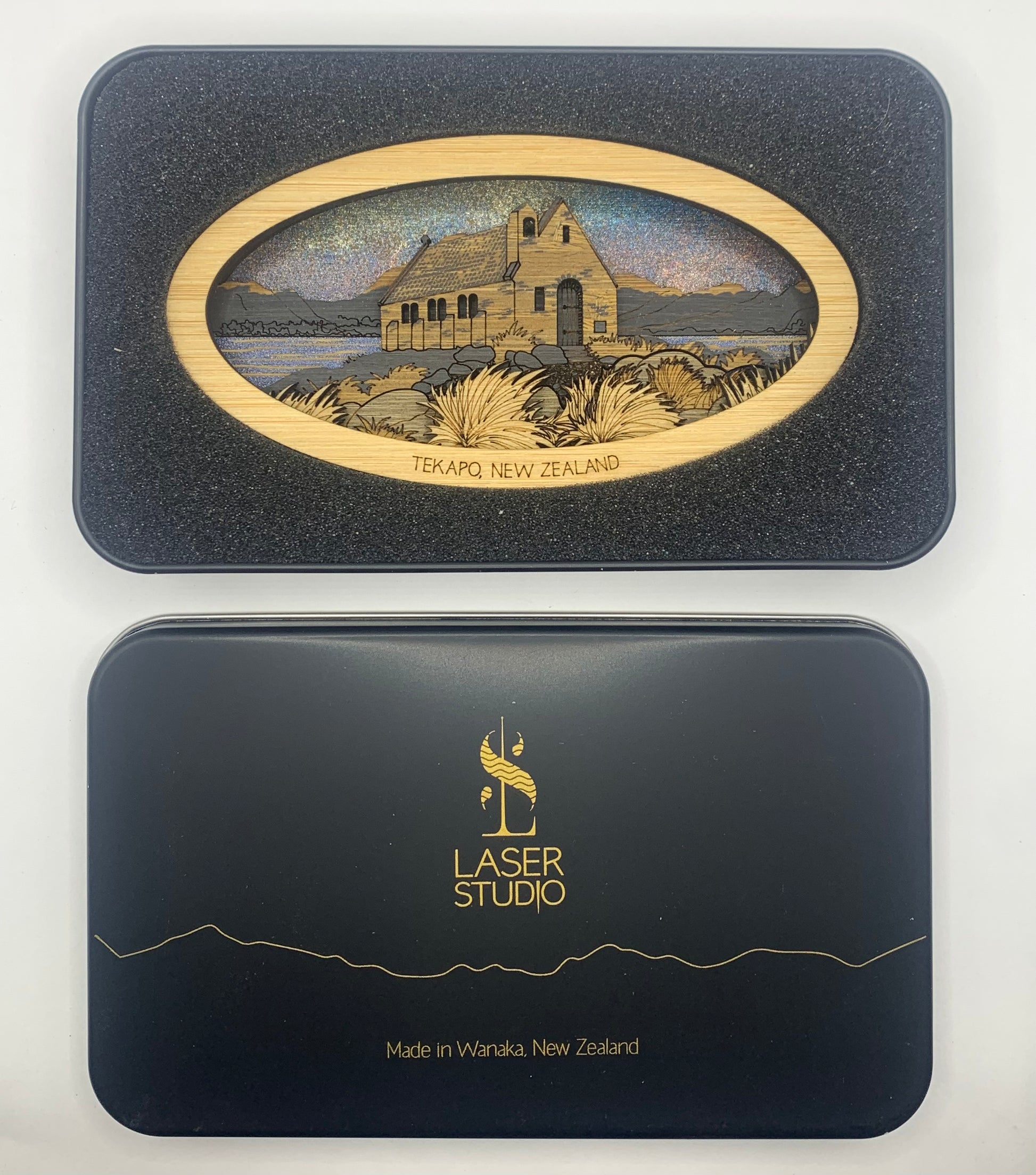 The Tekapo - starry night Mini-Scenic features the famous Church of the Good Shepherd nestled amongst tussocks with a starry night background.